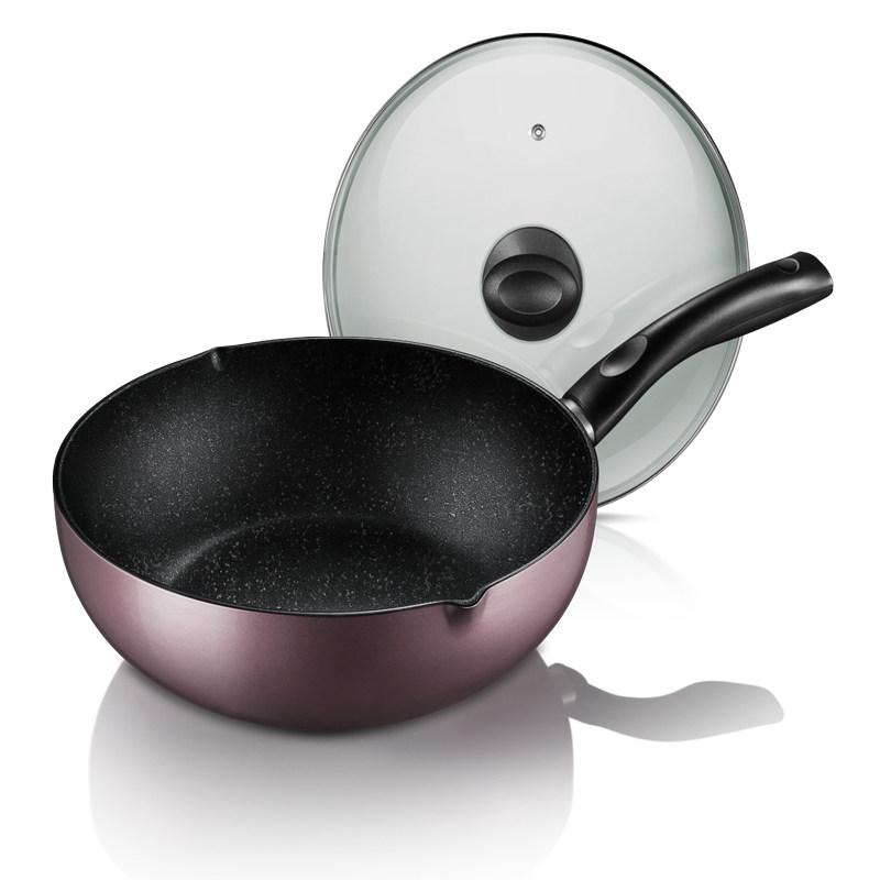 描述:煎炒两用不粘锅,电磁炉、明火等各种炉通用,双向导流设计,麦饭石涂层,不沾不糊,高温耐磨稳定,易清洗,一冲即净,高纯度铝合金锅身,受热更均匀更耐用,轻油享美食,炒菜省时省力!