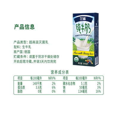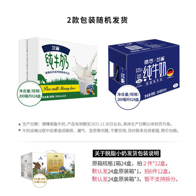 【兰雀】高钙脱脂纯牛奶200ml*24盒