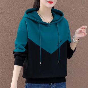 连帽拼接卫衣女春秋薄款大码宽松女装上衣