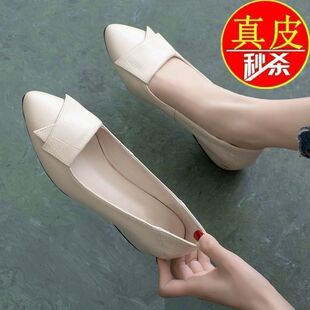 真皮单鞋女新款平底粗跟尖头软皮女鞋工作鞋