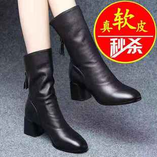 真软皮短靴女中跟尖头202秋冬季新款中筒