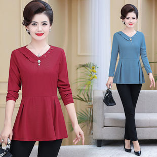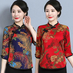 秋季新旗袍领中袖T恤妈妈装遮肚洋打底衫