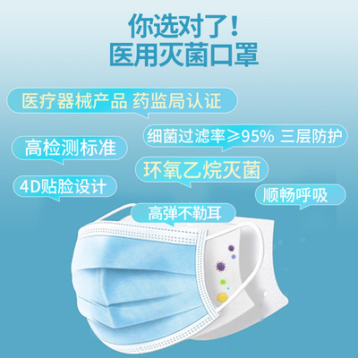 【50只】掌护三层医用外科灭菌级口罩蓝色